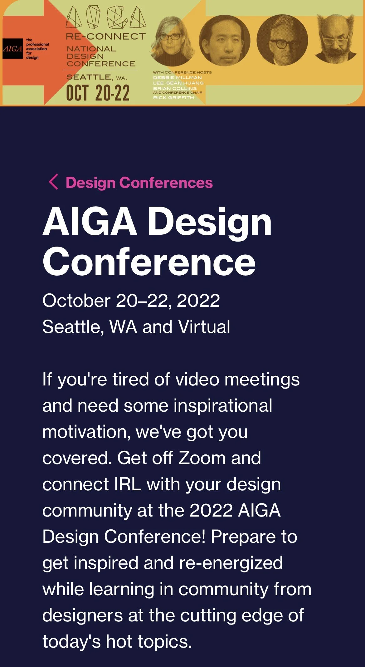 If you’re tired of video meetings and need some inspirational motivation, AIGA has you covered. Get off Zoom and connect IRL in Seattle with your design community at the 2022 AIGA Design Conference! Prepare to get inspired and re-energized while learning from designers at the cutting edge of today’s hot topics in the community.